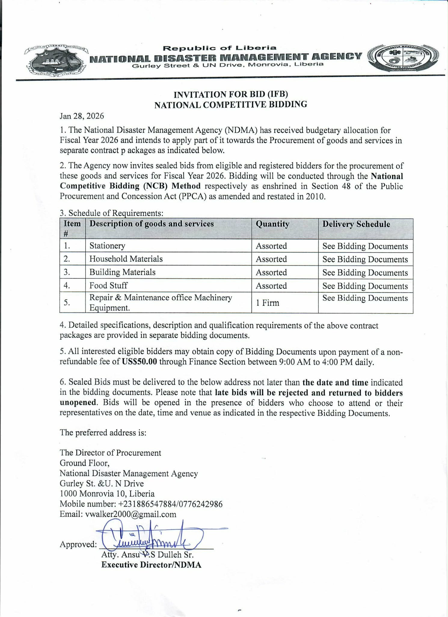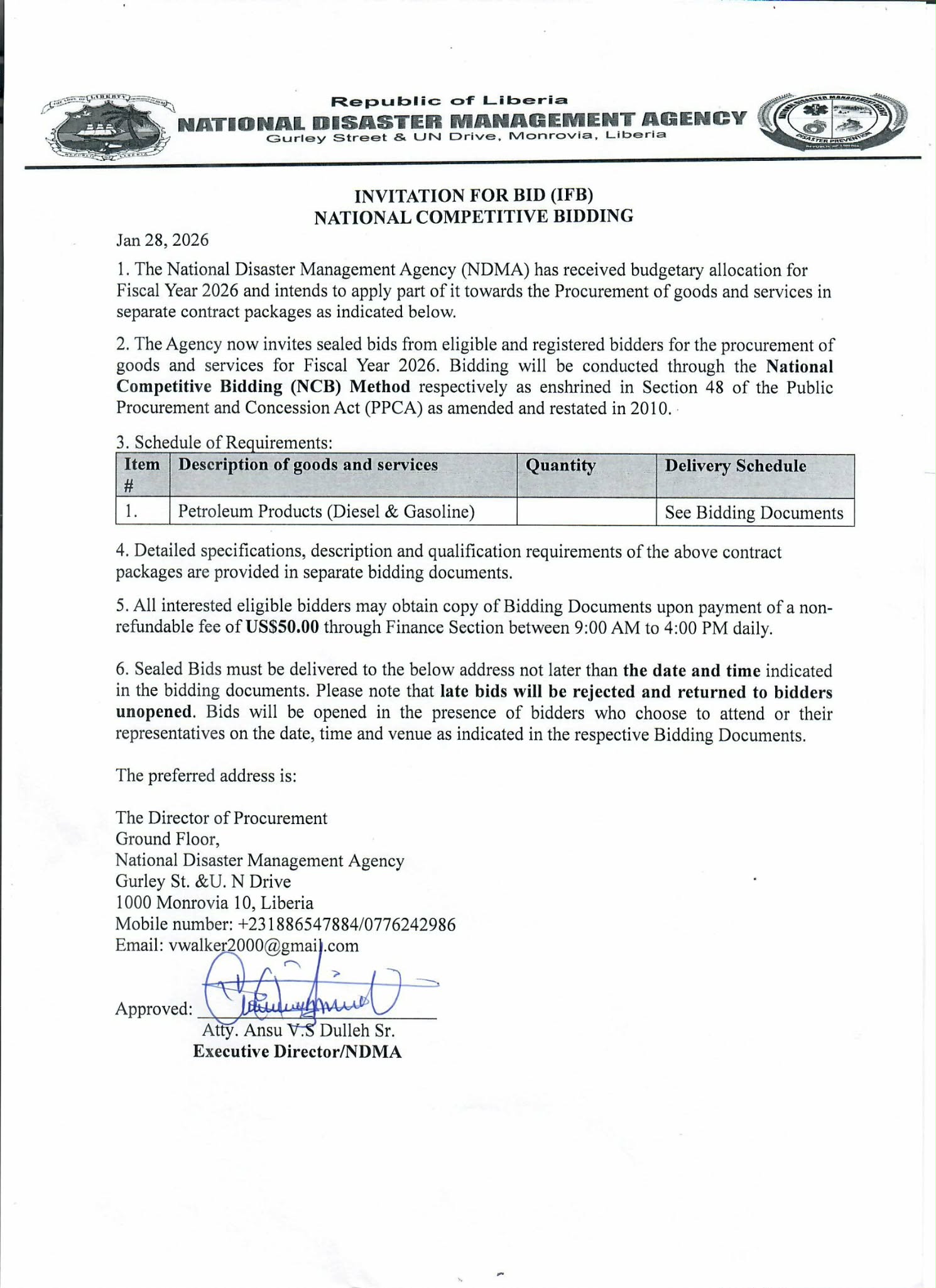 Procurement Invitation For Bid (IFB) National Competitive Bidding supply of goods and services January 28, 2026 Invitation For Bid (IFB) National Competitive Bidding supply of petroleum product (Gas and Fuel) January 28, 2025